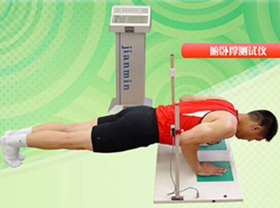 测试意义 俯卧撑测试反映的是人体上肢、肩背部肌肉力量及维持工作能力。是评价人体生长发育水平和体质状况的一项常用机能指标。 测试方法 使用垫子测试。 测试时,受试者双手撑地,手指向前,双手间距与肩同宽,身体挺直,屈臂使身体平直下降至肩与肘处于同一水平面,然后将身体平直撑起,恢复至开始姿势为完成1次。记录次数。 注意事项 测试时,如果身体未保持平直或身体未降至肩与肘处于同一水平面,该次不计数。