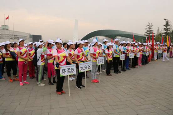 9月15日,2017年北京市农民健身徒步走大会在北京园博园内举行。来自北京市13个区的600多名农民朋友参加了活动,大兴区体育局组织40余名农民朋友们也融入其中。